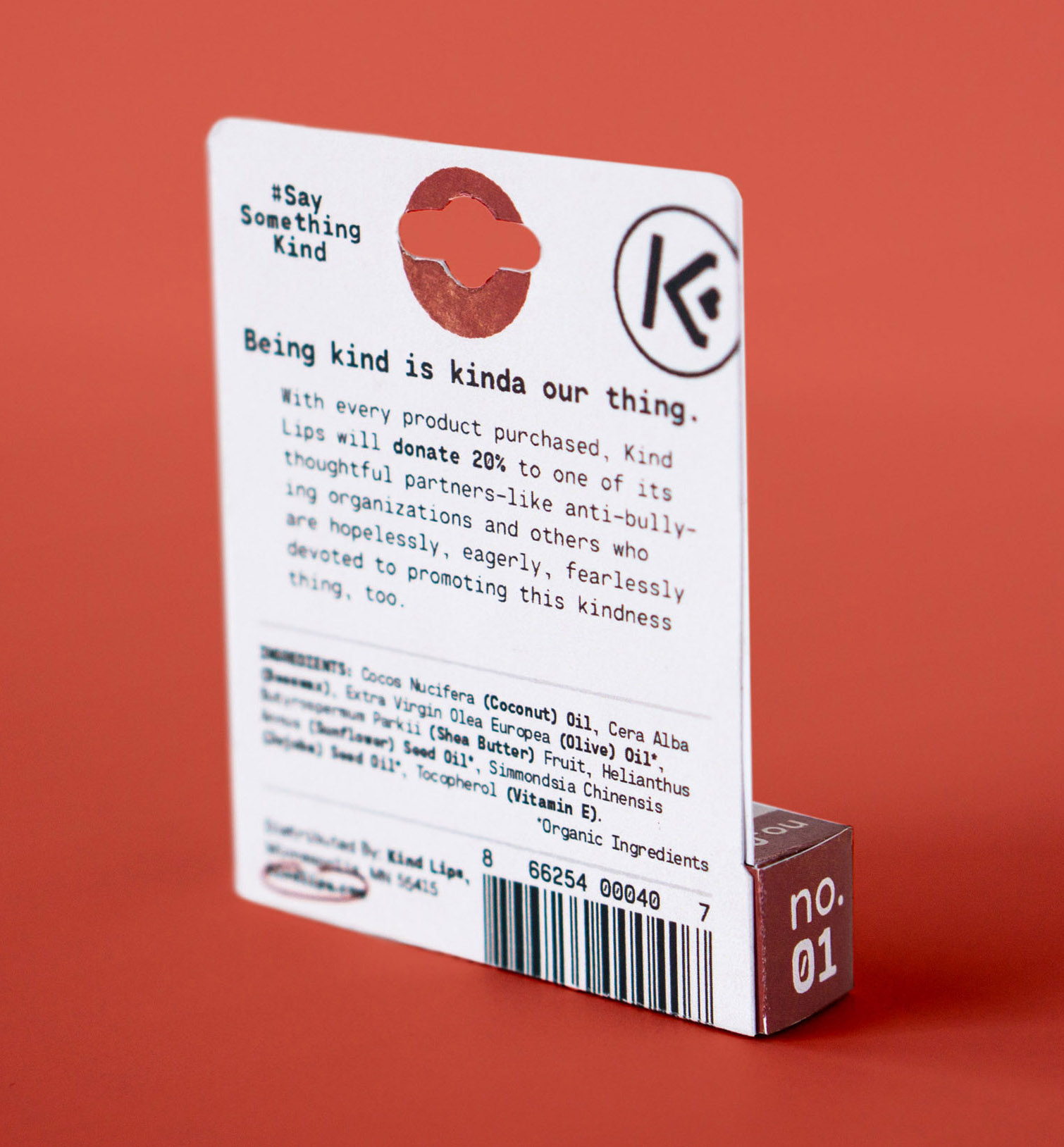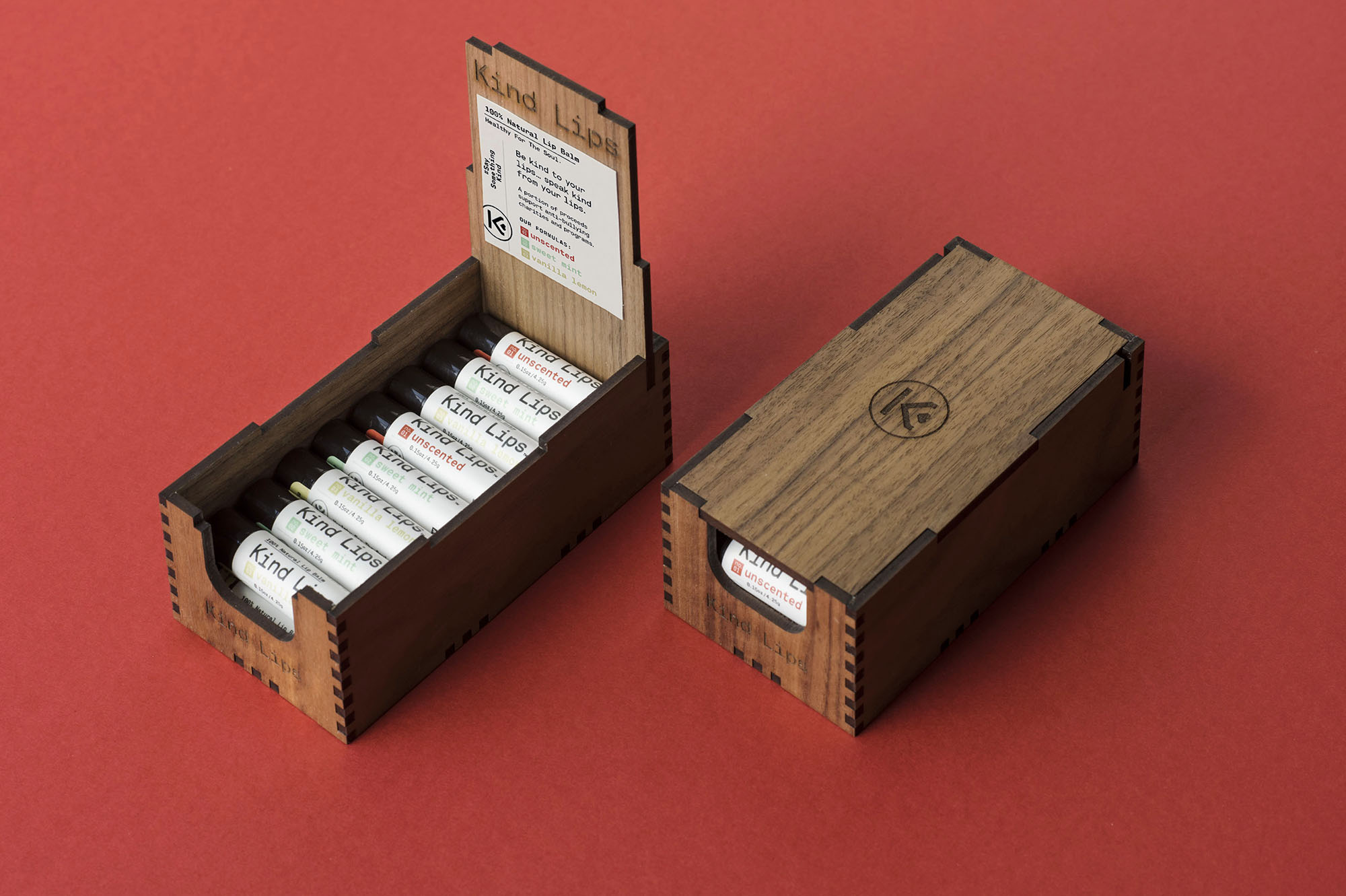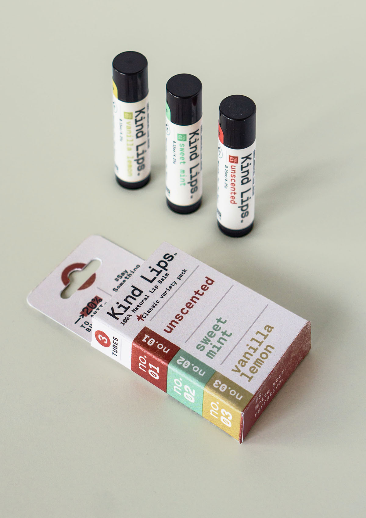 Kind Lips’ flagship product is their 100% Natural Lip Balm line. As these tubes are small, packaging had to be meticulously thought through to include only the essential.