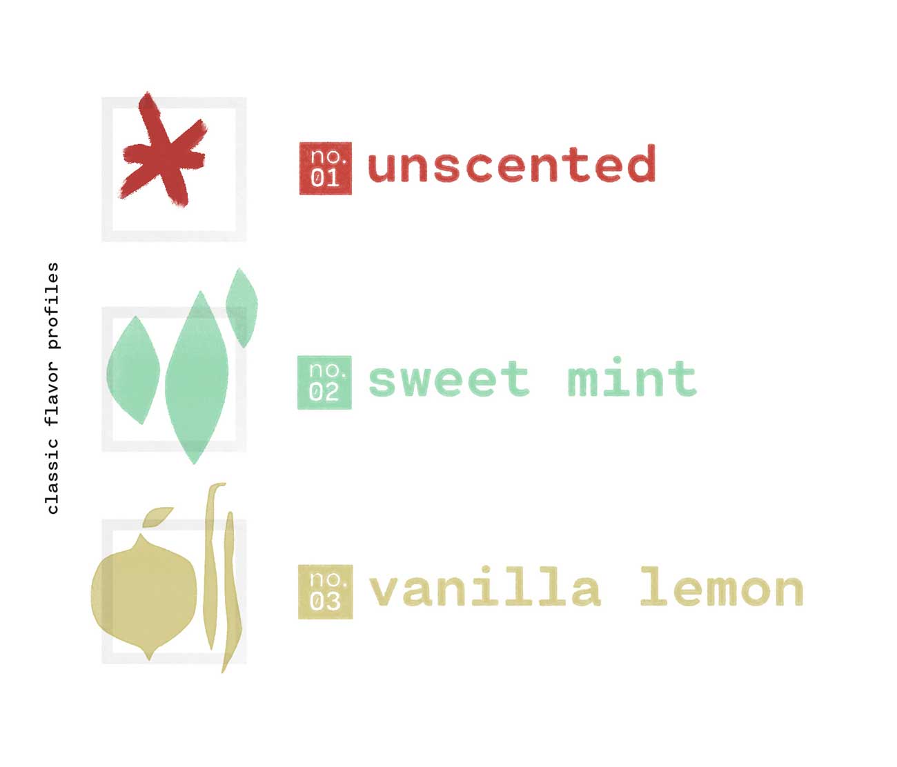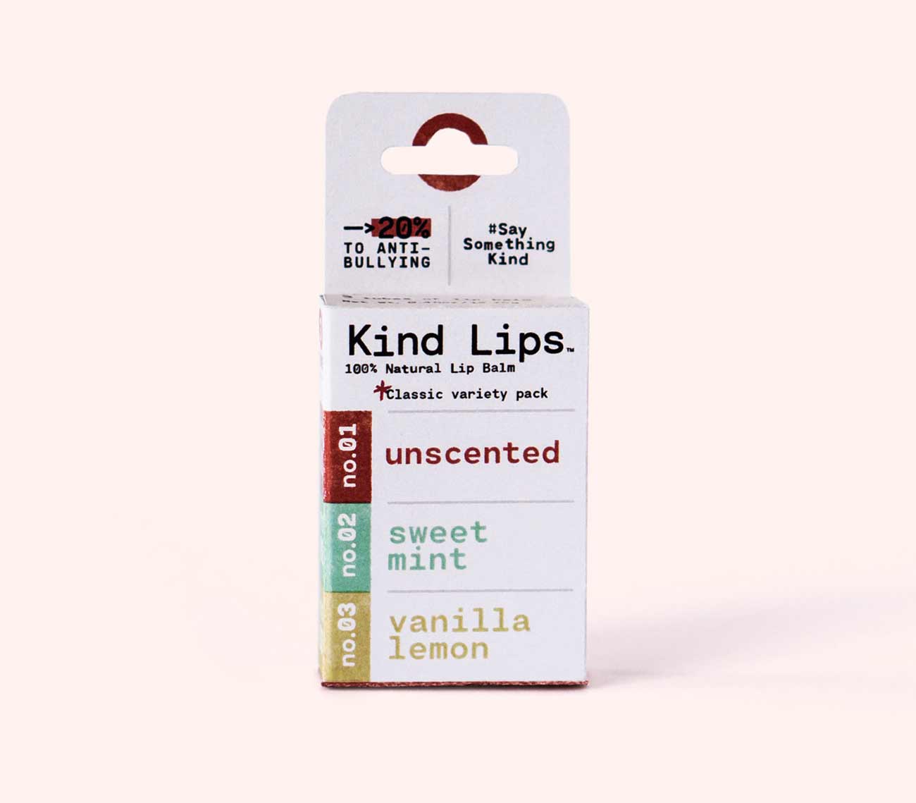 Typographical hierarchy and selective color are what separate the different flavors of lip balm, each represented by its own formula number. The lack of flavor illustrations (on-tube) and bright colors gives the Kind Lips tube packaging a distinctive presence on shelf and helps it to work in both commercial and boutique retail environments.