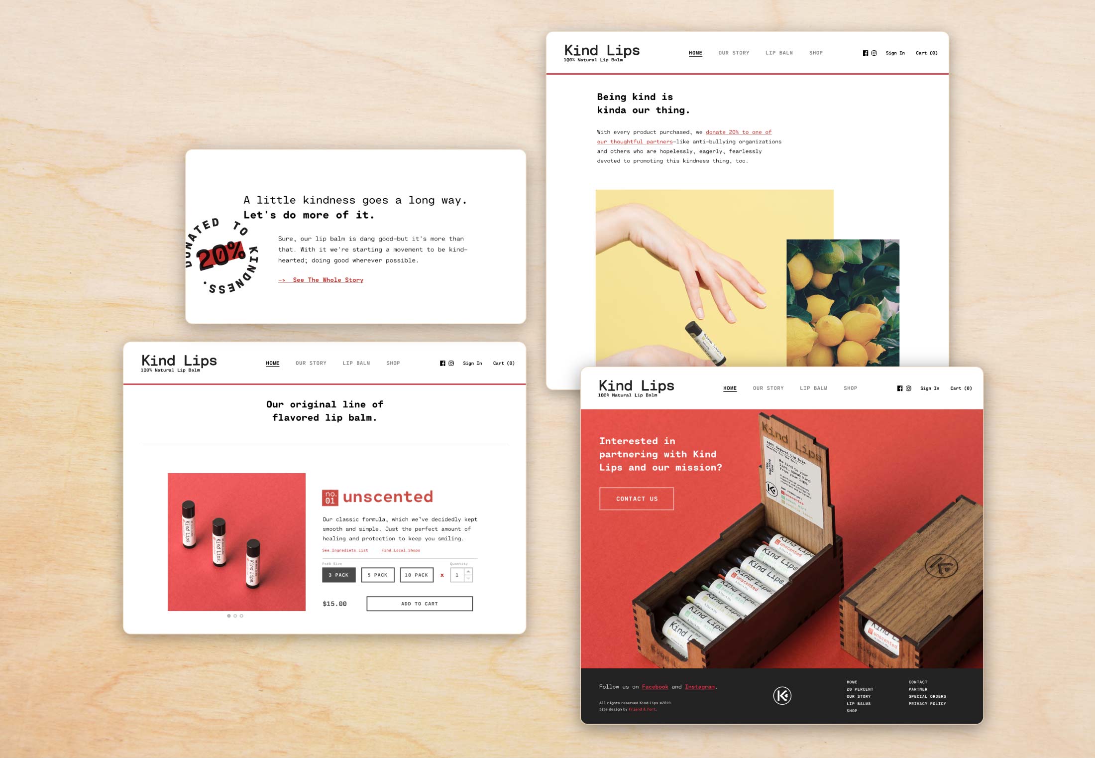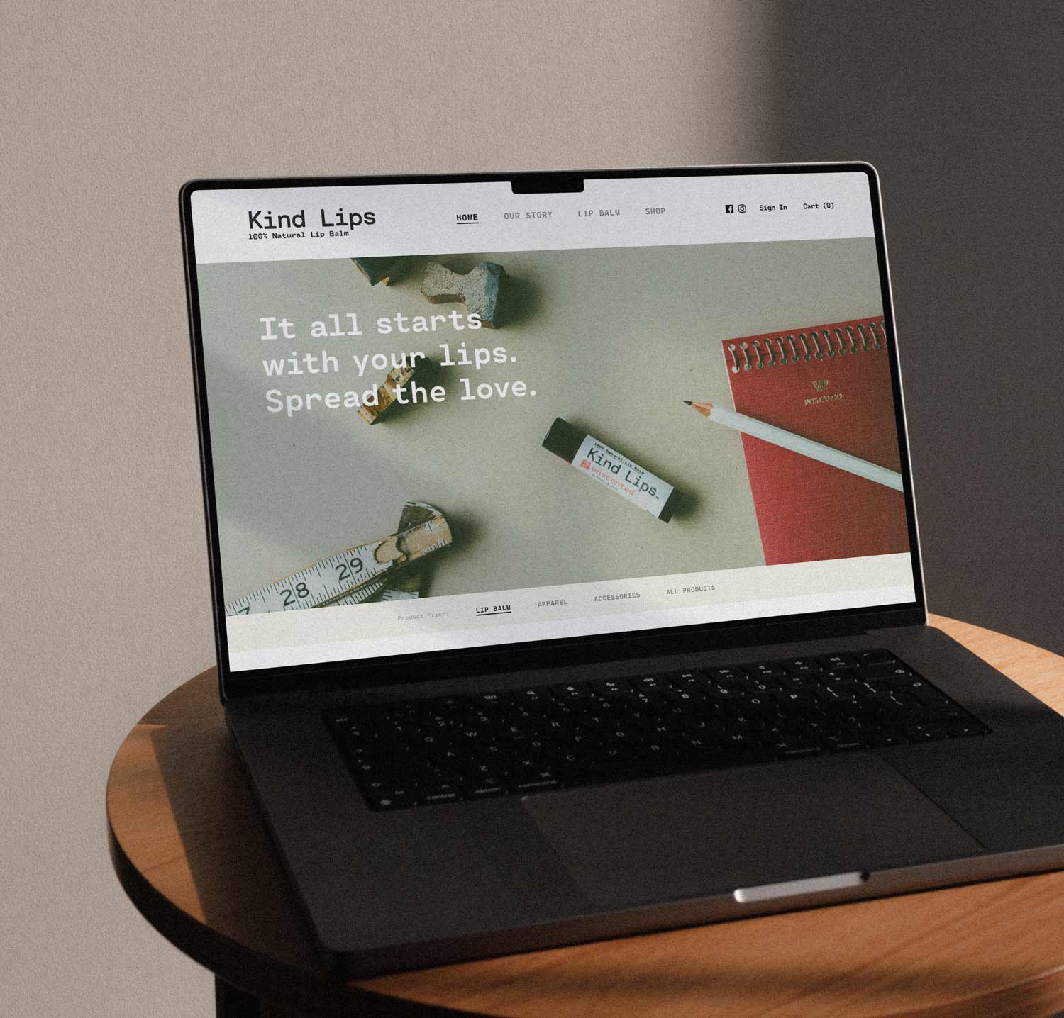 The Kind Lips brand presents itself with honesty, first and foremost. Selling a product that is positioned as good for both your body and mind meant all extensions of brand needed to be transparent and direct. We decided to give the visual look elements of texture and tactility while utilizing the typographical and monochromatic feel of traditional medicine. There are no frills here, only intentional simplicity.