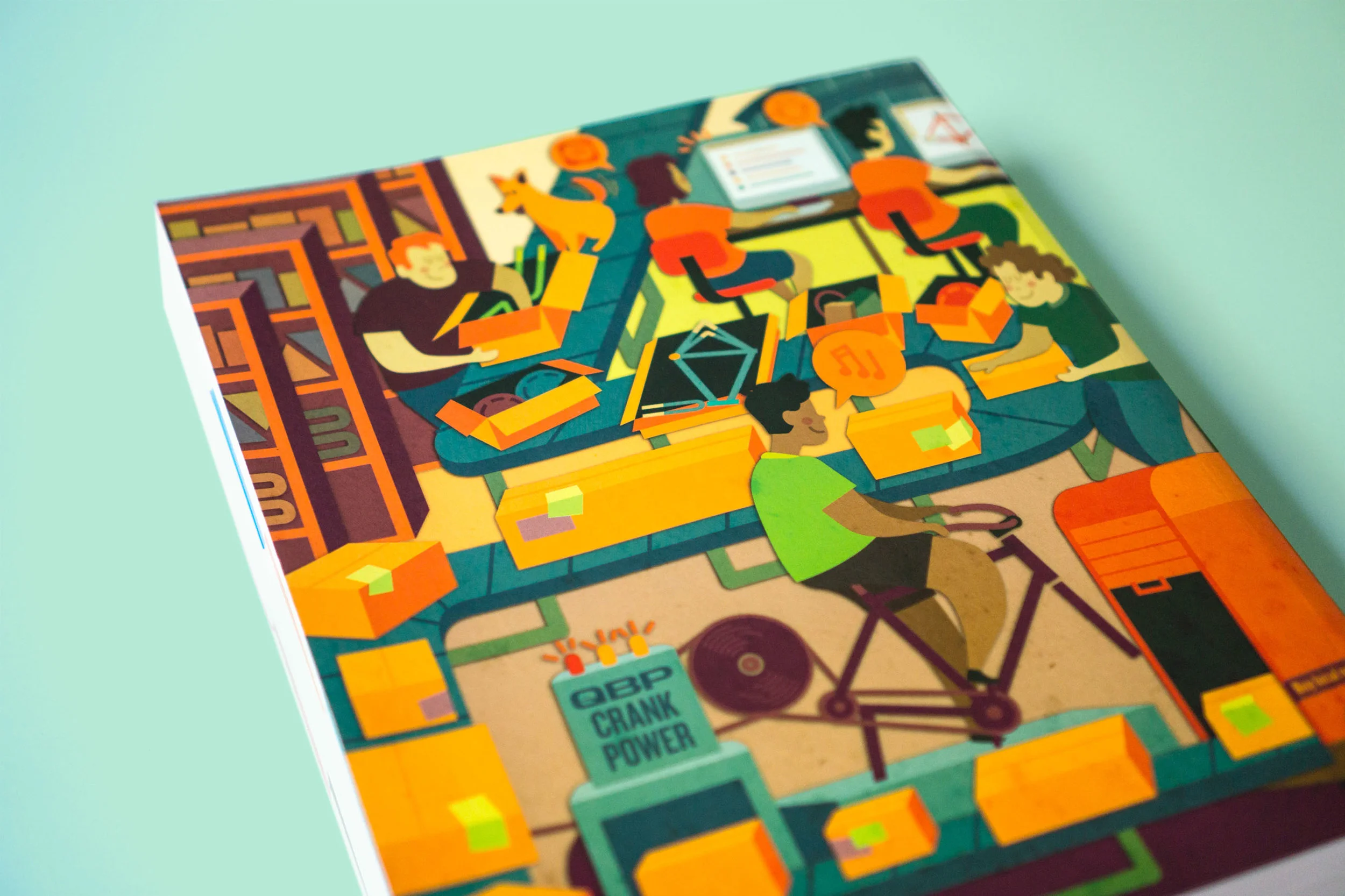 QBP puts out a new catalog each year with their latest stock of frames, parts and accessories that bike shops can order directly from. They commission an artist each year to illustrate and brand the cover. The theme for 2015 was People Powered Business.